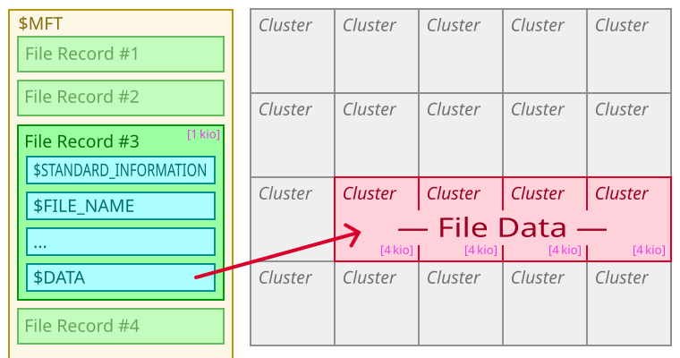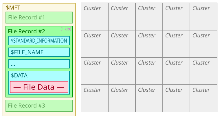 Si le résultat de ce calcul est inférieur ou égal à la taille d'un File Record (1 kio) alors je considère que $DATA est résident et donc que le fichier est stocké dans la MFT (taille = 1 kio). Sinon je considère qu'il est non-résident et qu'il est donc stocké en dehors de la MFT (taille = 1 kio + n × 4 kio, où n est le nombre suffisant de cluster pour contenir le fichier).