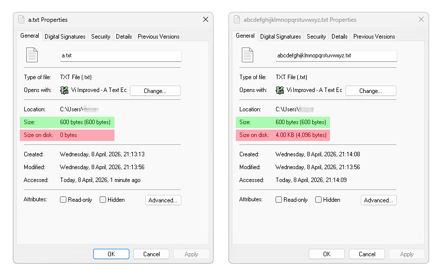 - Pour le premier Windows indique qu'il occupe 0 octet sur le disque, malgré le fait que la taille brute du fichier est bien rapportée (600 octets). Cela s'explique par le fait qu'aucun cluster n'a été alloué pour le fichier, et que Windows ne tient pas compte de la place occupée dans la MFT.